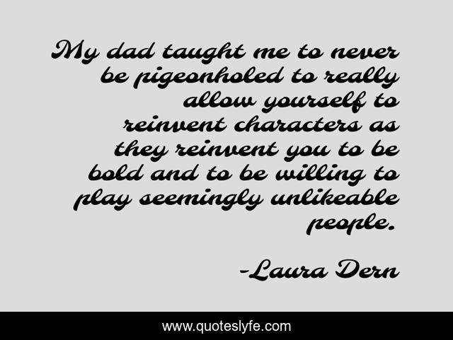 This page presents the quote "My dad taught me to never be pigeonholed to really allow yourself to reinvent characters as they reinvent you to be bold and to be willing to play seemingly unlikeable people.". Author of this quote is Laura Dern. This quote is about me, yourself, people,.