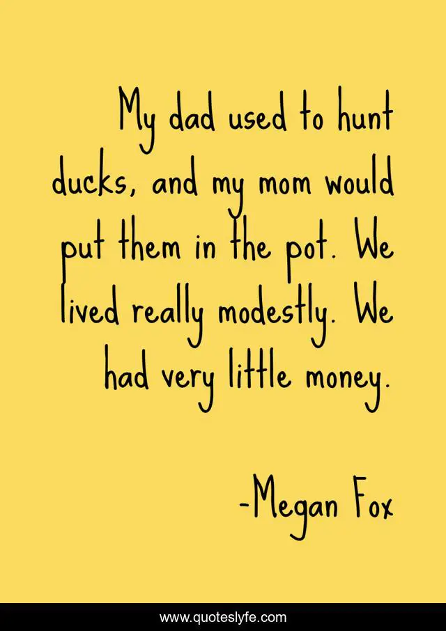 This page presents the quote "My dad used to hunt ducks, and my mom would put them in the pot. We lived really modestly. We had very little money.". Author of this quote is Megan Fox. This quote is about money, little, lived,.
