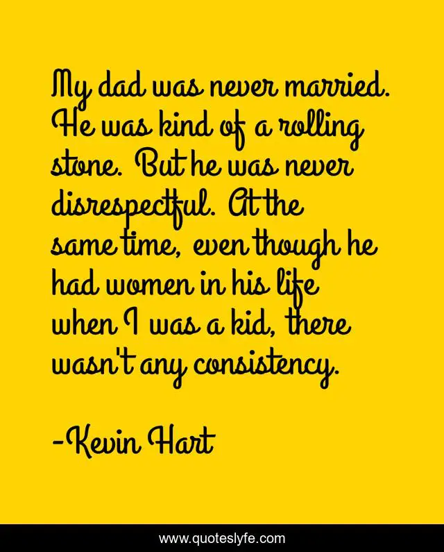 This page presents the quote "My dad was never married. He was kind of a rolling stone. But he was never disrespectful. At the same time, even though he had women in his life when I was a kid, there wasn't any consistency.". Author of this quote is Kevin Hart. This quote is about life, time, women,.