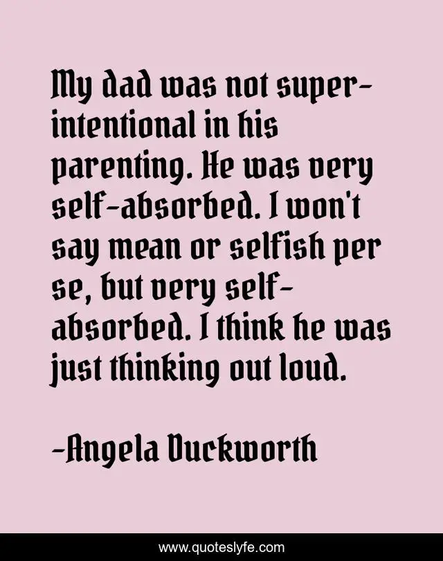 This page presents the quote "My dad was not super-intentional in his parenting. He was very self-absorbed. I won't say mean or selfish per se, but very self-absorbed. I think he was just thinking out loud.". Author of this quote is Angela Duckworth. This quote is about thinking, selfish, think,.