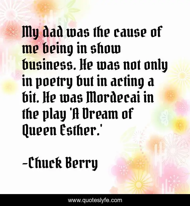 This page presents the quote "My dad was the cause of me being in show business. He was not only in poetry but in acting a bit. He was Mordecai in the play 'A Dream of Queen Esther.'". Author of this quote is Chuck Berry. This quote is about me, queen, business,.
