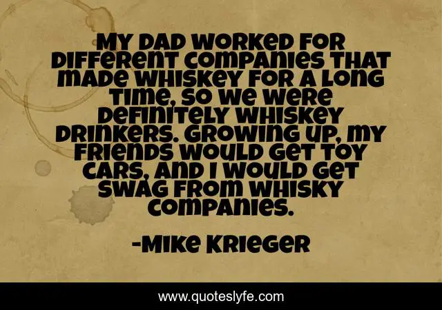 This page presents the quote "My dad worked for different companies that made whiskey for a long time, so we were definitely whiskey drinkers. Growing up, my friends would get toy cars, and I would get swag from whisky companies.". Author of this quote is Mike Krieger. This quote is about friends, growing up, time,.