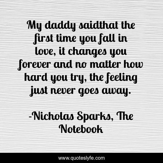 This page presents the quote "My daddy saidthat the first time you fall in love, it changes you forever and no matter how hard you try, the feeling just never goes away.". Author of this quote is Nicholas Sparks, The Notebook. This quote is about love, nicholas-sparks, affection, reality,.