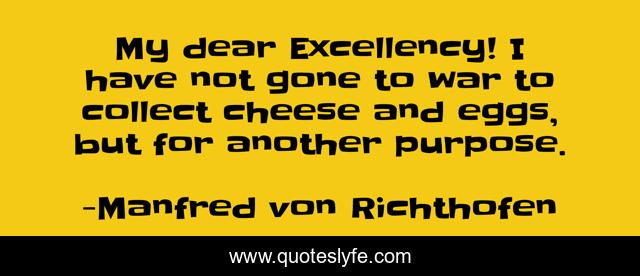 This page presents the quote "My dear Excellency! I have not gone to war to collect cheese and eggs, but for another purpose.". Author of this quote is Manfred von Richthofen. This quote is about cheese, eggs, purpose,.