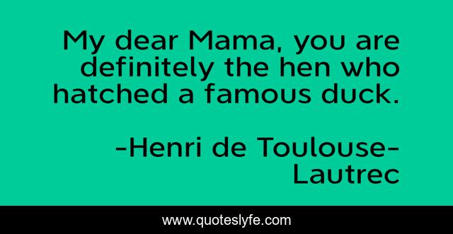 This page presents the quote "My dear Mama, you are definitely the hen who hatched a famous duck.". Author of this quote is Henri de Toulouse-Lautrec. This quote is about mother's day, duck,.