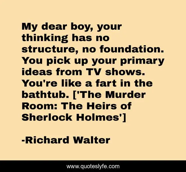 This page presents the quote "My dear boy, your thinking has no structure, no foundation. You pick up your primary ideas from TV shows. You're like a fart in the bathtub. ['The Murder Room: The Heirs of Sherlock Holmes']". Author of this quote is Richard Walter. .