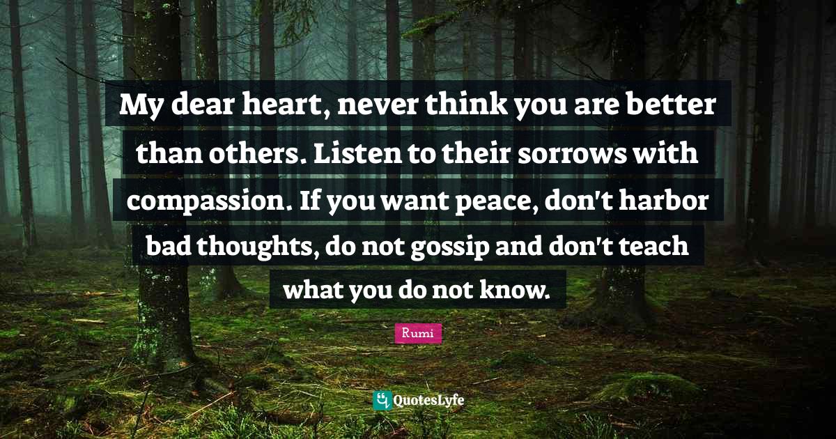 This page presents the quote "My dear heart, never think you are better than others. Listen to their sorrows with compassion. If you want peace, don't harbor bad thoughts, do not gossip and don't teach what you do not know.". Author of this quote is Rumi. This quote is about peace, gossip, want, compassion, thinking, dear, teach, bad thoughts, heart,.