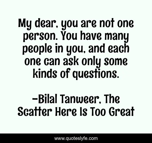 This page presents the quote "My dear, you are not one person. You have many people in you, and each one can ask only some kinds of questions.". Author of this quote is Bilal Tanweer, The Scatter Here Is Too Great. This quote is about karachi, city, bilal-tanweer, pakistan,.