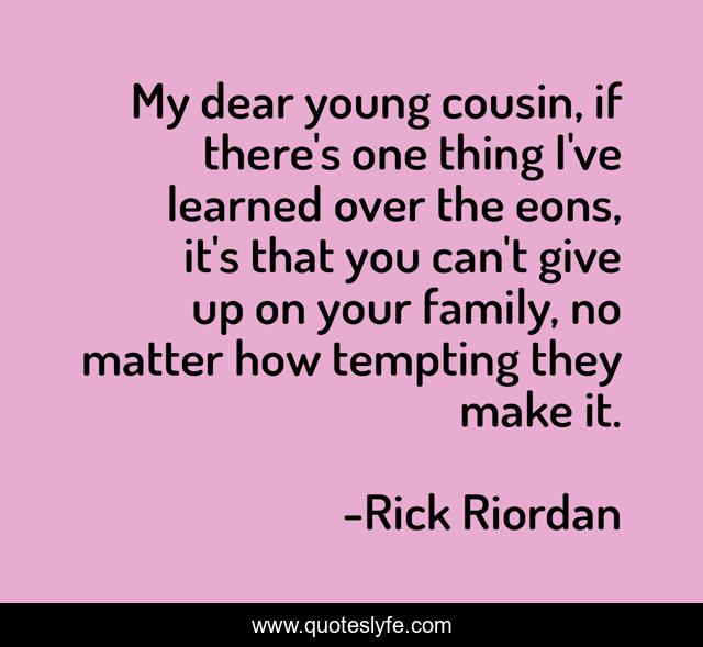 This page presents the quote "My dear young cousin, if there's one thing I've learned over the eons, it's that you can't give up on your family, no matter how tempting they make it.". Author of this quote is Rick Riordan. .