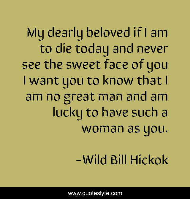 This page presents the quote "My dearly beloved if I am to die today and never see the sweet face of you I want you to know that I am no great man and am lucky to have such a woman as you.". Author of this quote is Wild Bill Hickok. This quote is about great, today,.