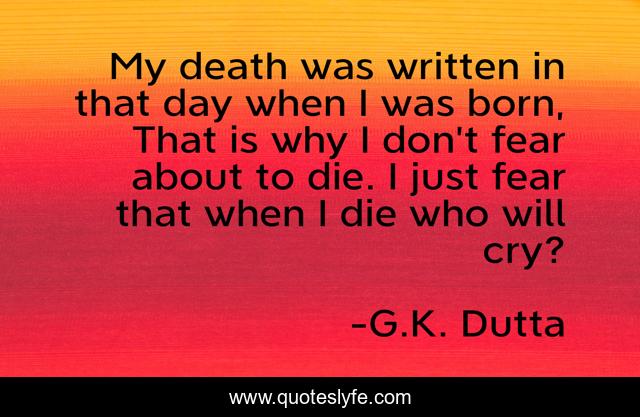 This page presents the quote "My death was written in that day when I was born, That is why I don’t fear about to die. I just fear that when I die who will cry?". Author of this quote is G.K. Dutta. This quote is about confidence, positive, motivational, leadership, optimistic, inspirational, enthusiasm,.
