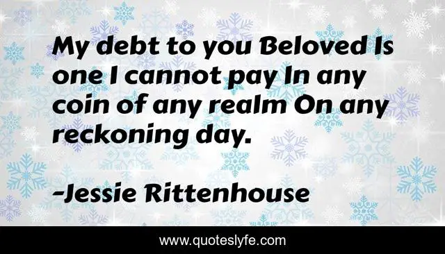 This page presents the quote "My debt to you Beloved Is one I cannot pay In any coin of any realm On any reckoning day.". Author of this quote is Jessie Rittenhouse. .