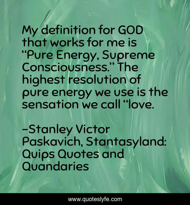 This page presents the quote "My definition for GOD that works for me is “Pure Energy, Supreme Consciousness.” The highest resolution of pure energy we use is the sensation we call “love.". Author of this quote is Stanley Victor Paskavich, Stantasyland: Quips Quotes and Quandaries. This quote is about pure-energy, power, god, energy, supreme-consciousness, theologians,.