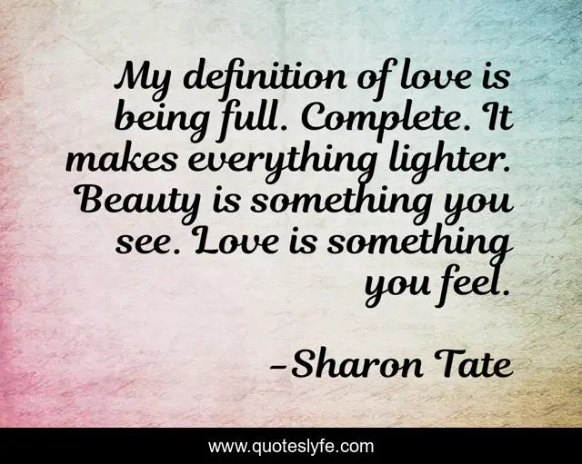 This page presents the quote "My definition of love is being full. Complete. It makes everything lighter. Beauty is something you see. Love is something you feel.". Author of this quote is Sharon Tate. This quote is about love, affection, love is,.