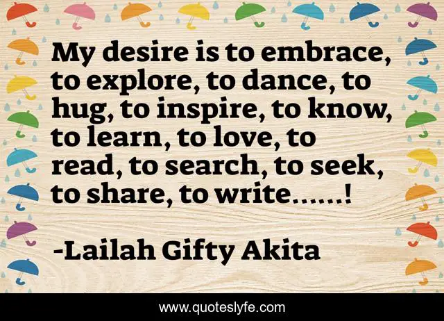 This page presents the quote "My desire is to embrace, to explore, to dance, to hug, to inspire, to know, to learn, to love, to read, to search, to seek, to share, to write……!". Author of this quote is Lailah Gifty Akita. This quote is about education, passion, lailah-gifty-akita-affirmations, desires, reading,.