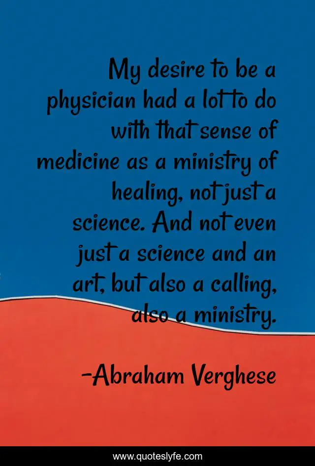 This page presents the quote "My desire to be a physician had a lot to do with that sense of medicine as a ministry of healing, not just a science. And not even just a science and an art, but also a calling, also a ministry.". Author of this quote is Abraham Verghese. This quote is about medicine, art, healing,.