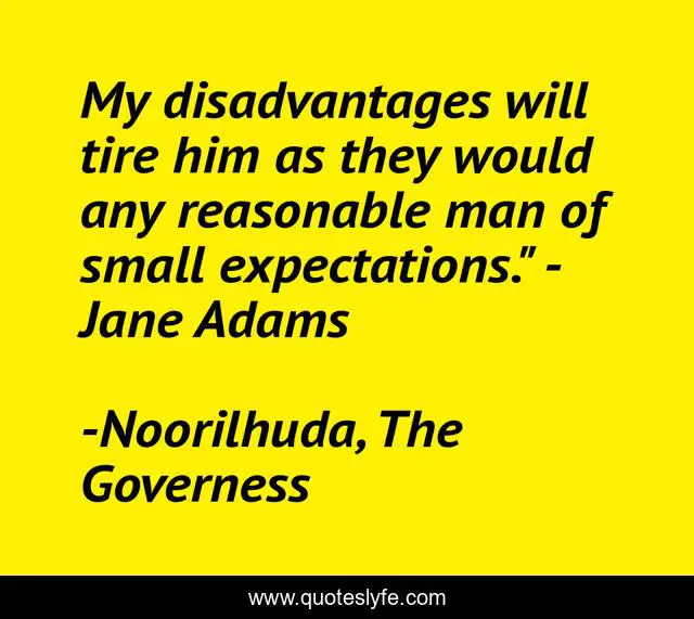 This page presents the quote "My disadvantages will tire him as they would any reasonable man of small expectations." - Jane Adams". Author of this quote is Noorilhuda, The Governess. This quote is about inspirational-attitude, regency-romance, christian-fiction, marital-advice,.