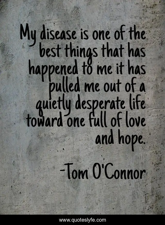 This page presents the quote "My disease is one of the best things that has happened to me it has pulled me out of a quietly desperate life toward one full of love and hope.". Author of this quote is Tom O'Connor. This quote is about positive, confidence,.
