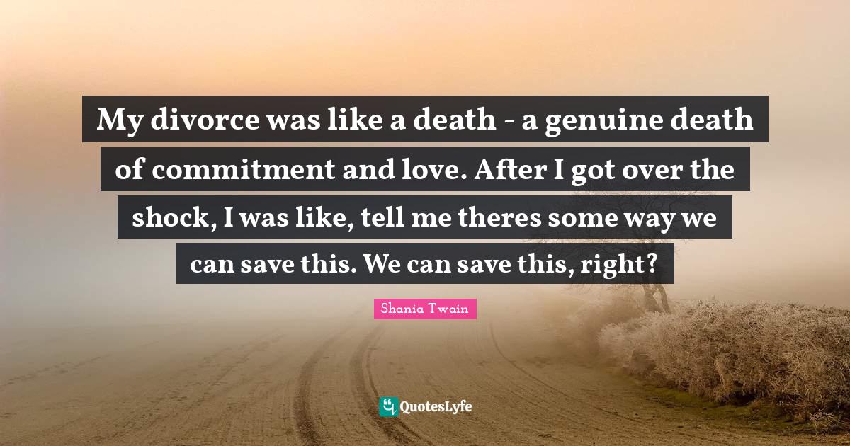This page presents the quote "My divorce was like a death - a genuine death of commitment and love. After I got over the shock, I was like, tell me theres some way we can save this. We can save this, right?". Author of this quote is Shania Twain. This quote is about death, way, commitment, divorce, and love, genuine, shock,.