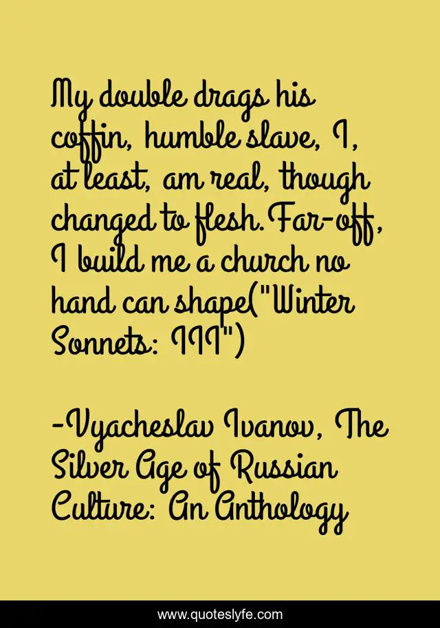 This page presents the quote "My double drags his coffin, humble slave, I, at least, am real, though changed to flesh.Far-off, I build me a church no hand can shape("Winter Sonnets: III")". Author of this quote is Vyacheslav Ivanov, The Silver Age of Russian Culture: An Anthology. This quote is about double, coffin, church,.