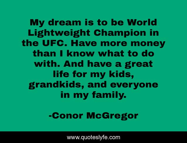 This page presents the quote "My dream is to be World Lightweight Champion in the UFC. Have more money than I know what to do with. And have a great life for my kids, grandkids, and everyone in my family.". Author of this quote is Conor McGregor. This quote is about money, life, great,.