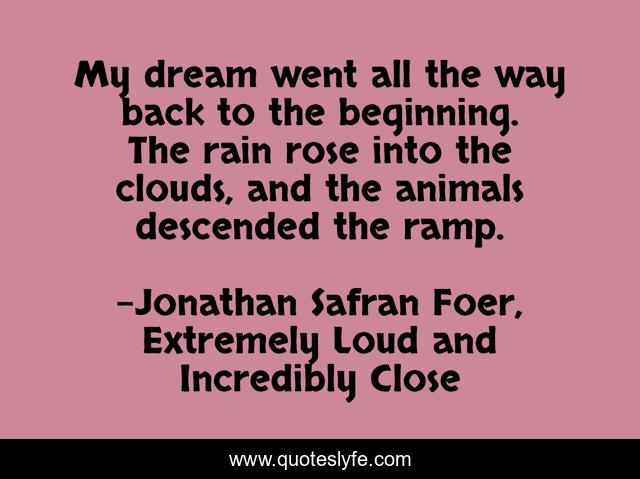 This page presents the quote "My dream went all the way back to the beginning. The rain rose into the clouds, and the animals descended the ramp.". Author of this quote is Jonathan Safran Foer, Extremely Loud and Incredibly Close. This quote is about beginning, dreams, noah-s-ark,.