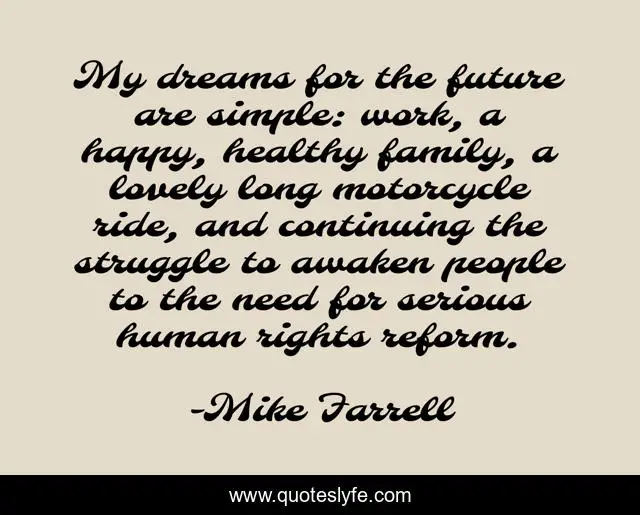 This page presents the quote "My dreams for the future are simple: work, a happy, healthy family, a lovely long motorcycle ride, and continuing the struggle to awaken people to the need for serious human rights reform.". Author of this quote is Mike Farrell. This quote is about work, future, family,.