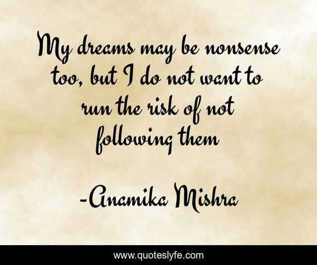 This page presents the quote "My dreams may be nonsense too, but I do not want to run the risk of not following them". Author of this quote is Anamika Mishra. This quote is about life, dreams, destiny, fate,.