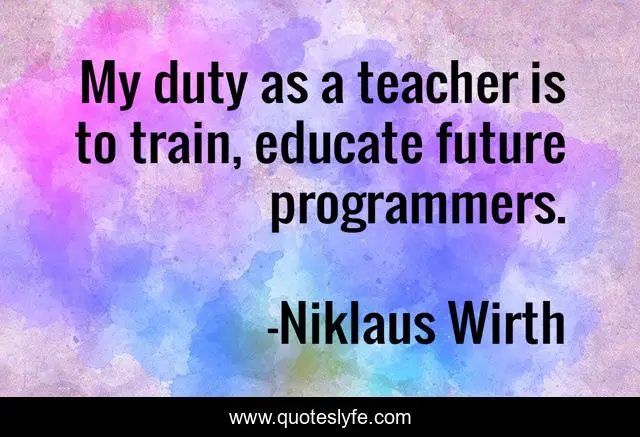 This page presents the quote "My duty as a teacher is to train, educate future programmers.". Author of this quote is Niklaus Wirth. This quote is about duty, future, train,.