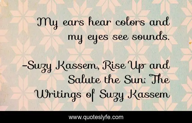 "Suzy Kassem, Rise Up and Salute the Sun: The Writings of Suzy Kassem Quotes." Quoteslyfe.com, 2025. Tue. 09 Dec. 2025. <https://www.quoteslyfe.com/quote/My-ears-hear-colors-and-my-eyes-66349>.
