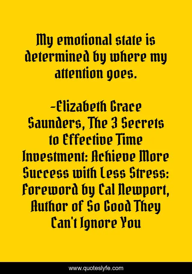 This page presents the quote "My emotional state is determined by where my attention goes.". Author of this quote is Elizabeth Grace Saunders, The 3 Secrets to Effective Time Investment: Achieve More Success with Less Stress: Foreword by Cal Newport, Author of So Good They Can't Ignore You. This quote is about motivation, self-improvement, inspiration,.