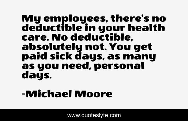 This page presents the quote "My employees, there's no deductible in your health care. No deductible, absolutely not. You get paid sick days, as many as you need, personal days.". Author of this quote is Michael Moore. This quote is about employees, care,.