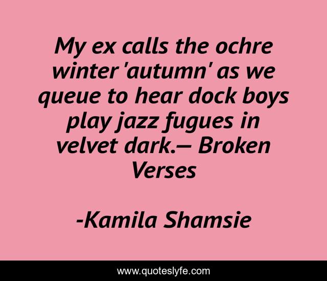 This page presents the quote "My ex calls the ochre winter 'autumn' as we queue to hear dock boys play jazz fugues in velvet dark.— Broken Verses". Author of this quote is Kamila Shamsie. This quote is about mystery, romance, code,.