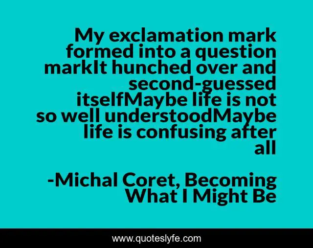 This page presents the quote "My exclamation mark formed into a question markIt hunched over and second-guessed itselfMaybe life is not so well understoodMaybe life is confusing after all". Author of this quote is Michal Coret, Becoming What I Might Be. This quote is about confusion, life, philosophy, poetry,.