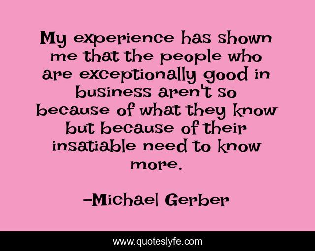 This page presents the quote "My experience has shown me that the people who are exceptionally good in business aren't so because of what they know but because of their insatiable need to know more.". Author of this quote is Michael Gerber. This quote is about me, good, experience,.