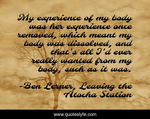 This page presents the quote "My experience of my body was her experience once removed, which meant my body was dissolved, and that’s all I’d ever really wanted from my body, such as it was.". Author of this quote is Ben Lerner, Leaving the Atocha Station. .