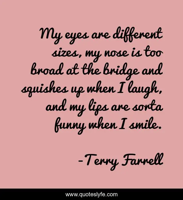 This page presents the quote "My eyes are different sizes, my nose is too broad at the bridge and squishes up when I laugh, and my lips are sorta funny when I smile.". Author of this quote is Terry Farrell. This quote is about funny, eyes, comedy, laugh,.