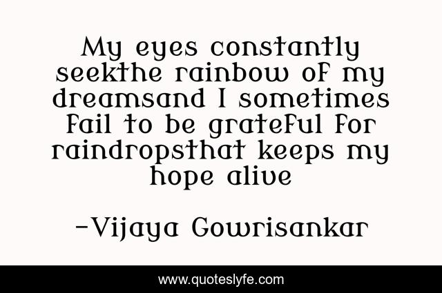 This page presents the quote "My eyes constantly seekthe rainbow of my dreamsand I sometimes fail to be grateful for raindropsthat keeps my hope alive". Author of this quote is Vijaya Gowrisankar. This quote is about gratitude, rainbow, eyes, dreams,.