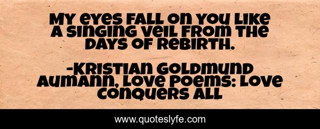 This page presents the quote "My eyes fall on you like a singing veil from the days of rebirth.". Author of this quote is Kristian Goldmund Aumann, Love Poems: Love Conquers All. This quote is about love, affection,.