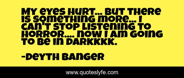 This page presents the quote "My eyes hurt... but there is something more... I can't stop listening to horror.... now I am going to be in darkkkk.". Author of this quote is Deyth Banger. This quote is about dark, eyes, something, but, hurt,.