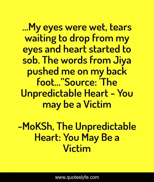This page presents the quote "…My eyes were wet, tears waiting to drop from my eyes and heart started to sob. The words from Jiya pushed me on my back foot…”Source: 'The Unpredictable Heart - You may be a Victim". Author of this quote is MoKSh, The Unpredictable Heart: You May Be a Victim. This quote is about love, affection, fiction,.