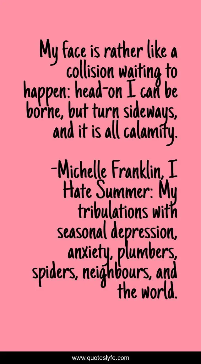 "Michelle Franklin, I Hate Summer: My tribulations with seasonal depression, anxiety, plumbers, spiders, neighbours, and the world. Quotes." Quoteslyfe.com, 2025. Fri. 05 Dec. 2025. <https://www.quoteslyfe.com/quote/My-face-is-rather-like-a-collision-56066>.