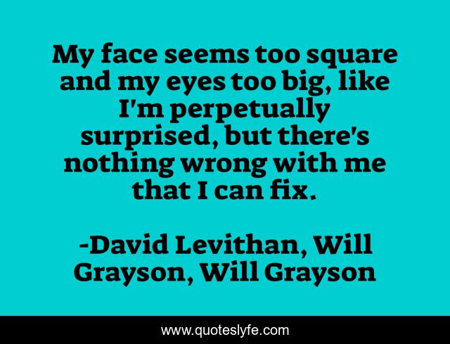 This page presents the quote "My face seems too square and my eyes too big, like I'm perpetually surprised, but there's nothing wrong with me that I can fix.". Author of this quote is David Levithan, Will Grayson, Will Grayson. This quote is about confidence, appearance, adolescence,.