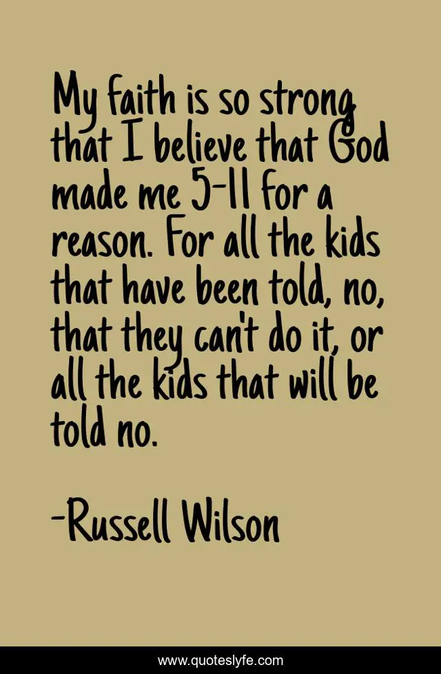 This page presents the quote "My faith is so strong that I believe that God made me 5-11 for a reason. For all the kids that have been told, no, that they can't do it, or all the kids that will be told no.". Author of this quote is Russell Wilson. This quote is about god, believe, strong,.