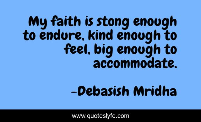 This page presents the quote "My faith is stong enough to endure, kind enough to feel, big enough to accommodate.". Author of this quote is Debasish Mridha. This quote is about faith, debasish, mridha, philosophy, debasish-mridha, accommodate, strength, kindness,.