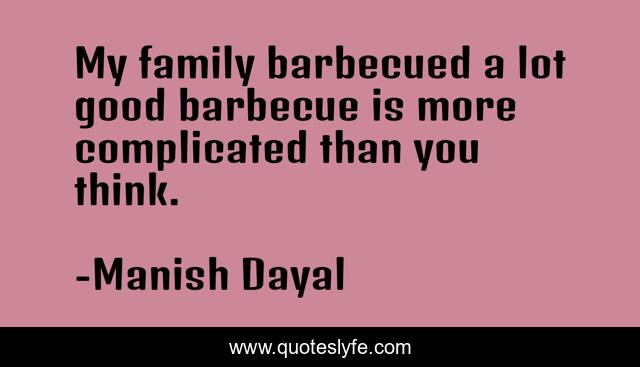 This page presents the quote "My family barbecued a lot good barbecue is more complicated than you think.". Author of this quote is Manish Dayal. This quote is about good, think,.
