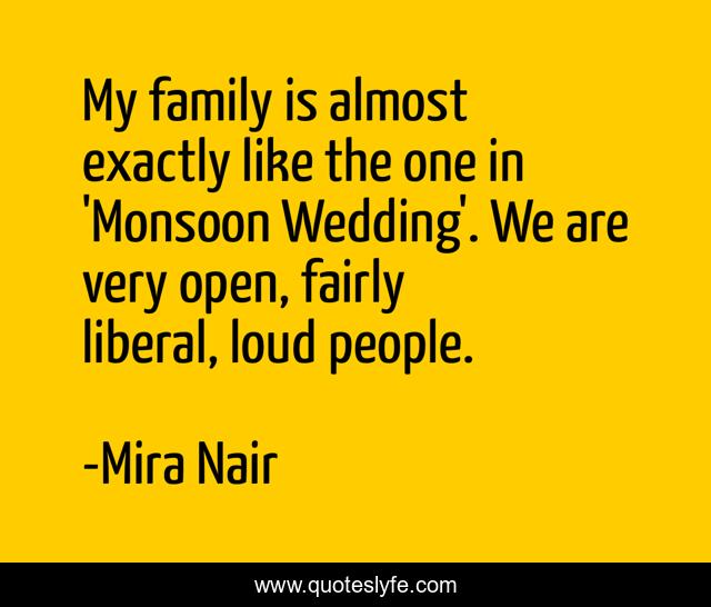 This page presents the quote "My family is almost exactly like the one in 'Monsoon Wedding'. We are very open, fairly liberal, loud people.". Author of this quote is Mira Nair. This quote is about liberal, family, people,.