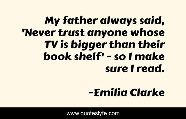 This page presents the quote "My father always said, 'Never trust anyone whose TV is bigger than their book shelf' - so I make sure I read.". Author of this quote is Emilia Clarke. This quote is about book, father, said,.
