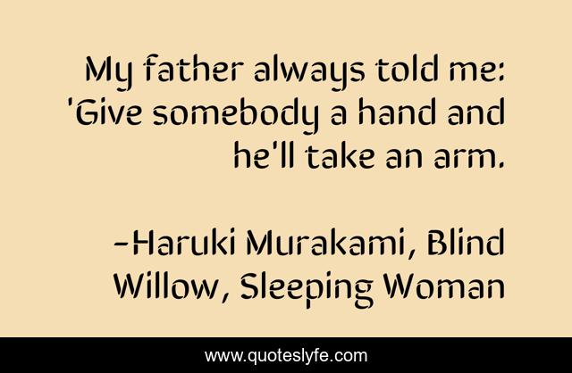 This page presents the quote "My father always told me: 'Give somebody a hand and he'll take an arm.". Author of this quote is Haruki Murakami, Blind Willow, Sleeping Woman. This quote is about advice, help,.
