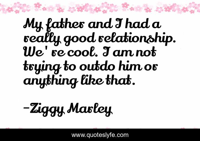 This page presents the quote "My father and I had a really good relationship. We're cool. I am not trying to outdo him or anything like that.". Author of this quote is Ziggy Marley. This quote is about good, father, relationship,.